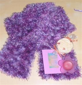 Sie bekam einen beerenfarbenen kuscheligen Schal aus Fransenwolle , dazu habe ich ihr ein farblich passendes Teelicht und eine Soleseife.
