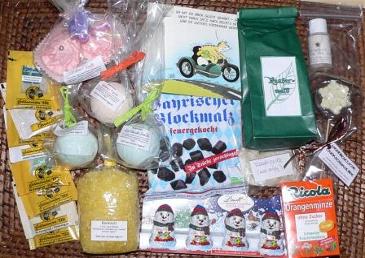 Sooo viele tolle Sachen: Badesalz, Badebomben, Badetörtchen (die Düfte kenn ich noch nicht , toll !) selbst gemachte Trinkschokolade lecker mit Zimt, Parfümöl, Tussahseide, Seife Zauberwald (ganz mein Duftgeschmack). Für den Hals Malzbonbons (lecker, die bekomm ich bei uns gar nicht), Orangenminzbonbons, viele leckere Kräutertees, Schokoeisbären und eine nette Karte.