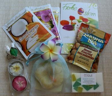 Meine Wichtelmum war auf Hawaii und hat mir folgendes mitgebracht: 3 verschiedene Badesalze, hübsche Teelichter, eine Seife mit transparenten Stücken, Macadamianüsse. Dann eine dazu passende Seife "Hibiscus" mit Blütenklämmerchen.