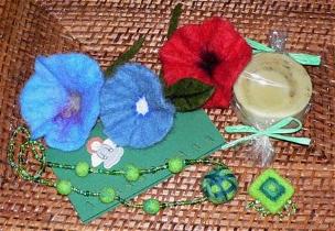 Sie bekam dafür eine Filzkette, 3 Filzblüten, einen Filzanhänger zum weiterverarbeiten und eine Seife dazu.